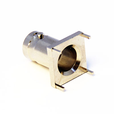 The 71X-0040-33 is a BNC outer connector body for PCB mounting and use with one of the inners of the 2 part system. It is made from brass with a nickel plating.