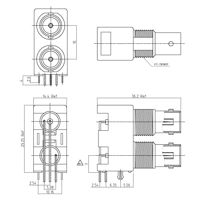 The C-SX-045 is a dual port vertical BNC socket for right angled PCB mounting. This connector comes supplied with a lock washer and hex nut.