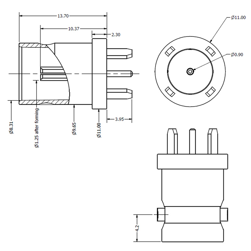 The C-SX-061 precision 75Ω BNC Connector is a top entry PCB mounted connector which combines the advantages of press fit or solder applications. This precision BNC Connector can be pressed into the PCB in one operation to secure the outer contacts. A further solder operation then provides the precision 75Ω bond with the centre contact. Other materials such as gold plating are available to customer requirement.
