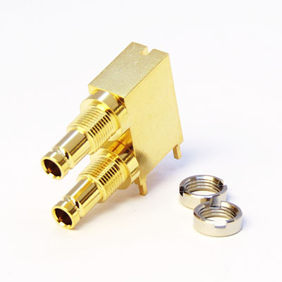 The C-SX-115G precision 75Ω DIN 1.0/2.3 Connector is a dual right angle PCB mounted bulkhead connector. This range of connectors meets the SMPTE 424M standard and is ideal for use in industrial process control and data acquisition applications. The connector is supplied with nuts.