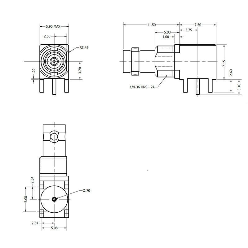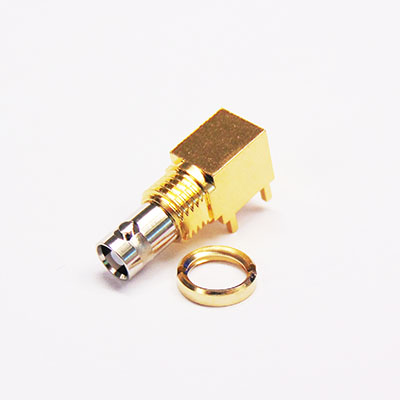 The C-SX-208 is a right angle slim body PCB Bulkhead Micro BNC socket with a 3.1mm leg length and is supplied with a 2 slot nut. The connector as been optimised to work in conjunction with our C-SX-172 dual port micro BNC connector.