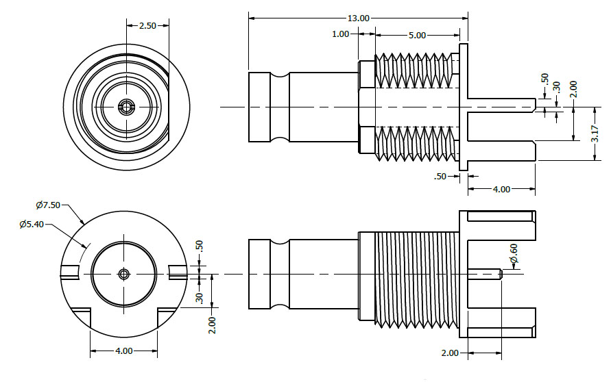 The C-SX-219GZZ is part of a range of connectors that have been designed with the same PCB footprint, giving a choice of connector style, which can be used on the same PCB design. Included in this edge mounted range are a 12GHz BNC connector (C-SX-220ZZ) and a Micro BNC connector (C-SX-147). The connectors in this range are for PCB thicknesses of 1.6mm. Nuts for this connector are sold seperately. All connectors in this range are also available for other board thicknesses.