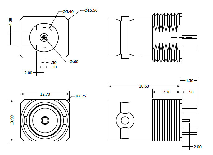 C-SX-068 – 3GHz Top Entry PCB Mounted BNC Connector (Square Based)
