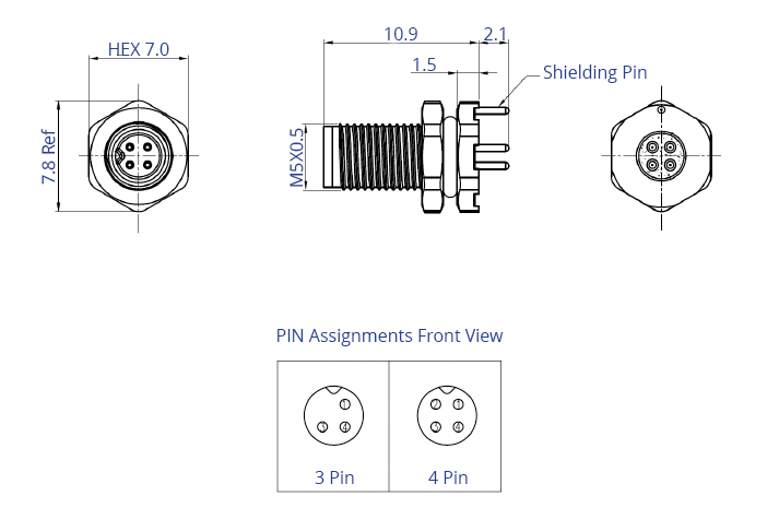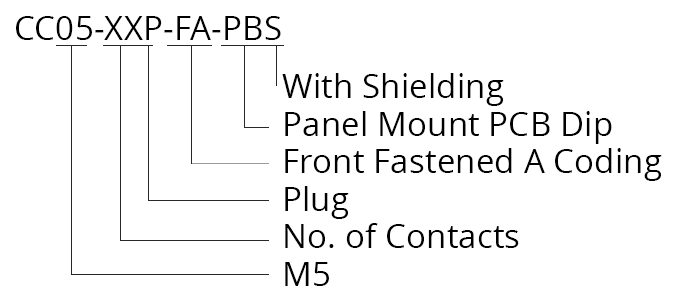 The CC05-XXP-FA-PBS is an M5 front fastening panel-mounted plug. This circular connector has an A coding, with the option of a 3 or 4 way pin assignment, with PCB through hole pins and shielding. The IP67 waterproof rating and screw lock nature of the M-series connectors maintains a secure connection for your data or power signals which is free from ingress of dust or water.
