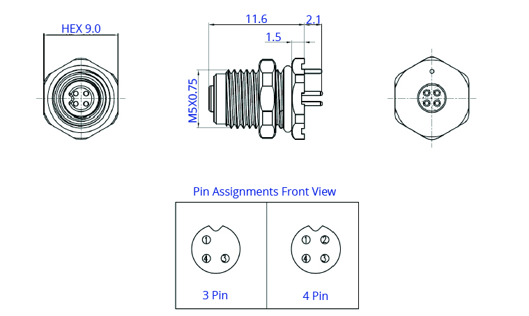 The CC05-XXS-FA-PBS8 is a M5 front fastening panel mounted socket with a shielding pin, to prevent interference. This circular connector is available in an A coding, with the option of a 3 or 4 way pin assignment and a PCB straight pin through hole termination to the rear. The M5 offers a compact and rugged design and a superior connection with its screw locking mechanism. The IP67 waterproof rating removes the concern of any dust or water entering your equipment.