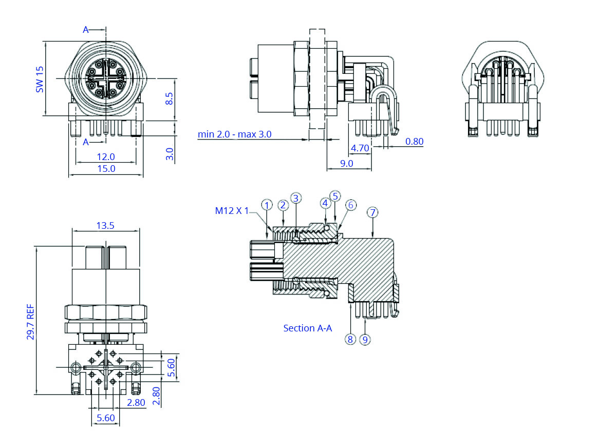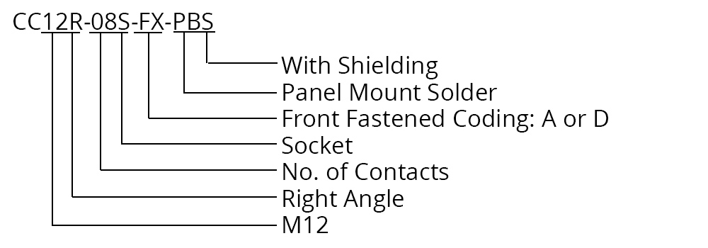 The CC12-08S-FX-PBS is a right angle M12 circular socket designed for mounting directly onto a PCB. It is available in an X coding with 8 pins with shielding. The connector has integrated PCB support points for holding into the board for precise location prior to soldering. The connectors have a front fastening nut for mounting onto an equipment panel of between 2 and 3mm in thickness.