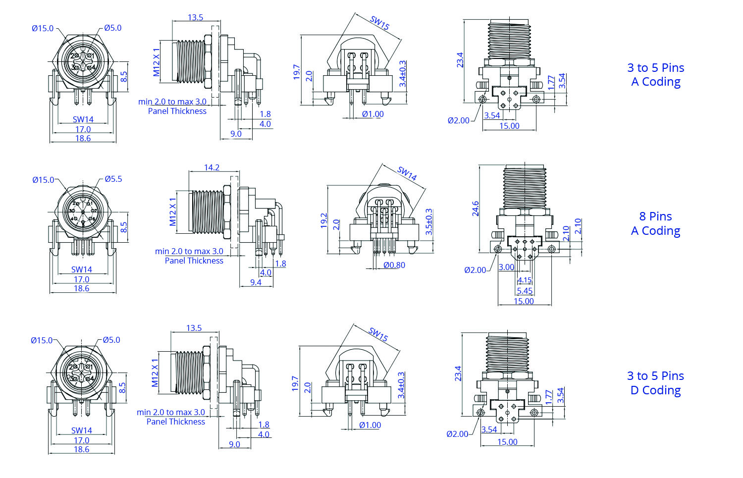 The CC12-XXP-FX-PB is a right angle M12 circular plug designed for mounting directly onto a PCB. It is available in an A or D coding with 3, 4, 5 and 8 pins. The connector has integrated PCB support points for holding into the board for precise location prior to soldering. The connectors have a front fastening nut for mounting onto an equipment panel of between 2 and 3mm in thickness.