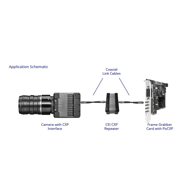 The in-line CoaXPress repeater is designed to transmit and receive signals on 75 ohm coaxial cable. In one direction an 8b/10b coded downlink signal is transmitted between 1.25 Gbps and 12.5 Gbps. In the opposite direction, a lower speed 8b/10b coded uplink signal is transmitted at 21Mbps or 42Mbps.