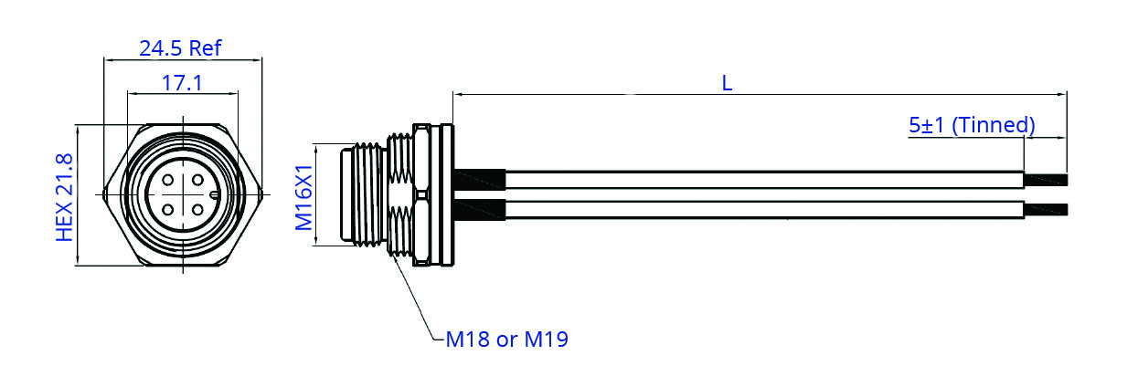 connector is supplied with either an M18 or M19 nut. The assembly can be supplied to your required length or can be made into a bespoke assembly with terminations of your choice to the other end.