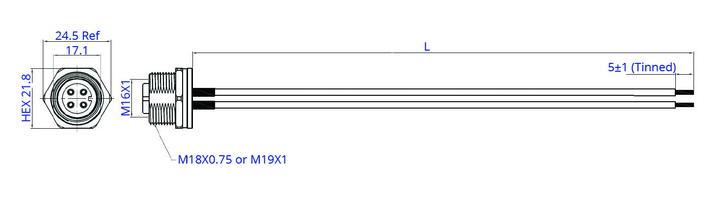 connector is supplied with either an M18 or M19 nut, depending on the number of pins. The assembly can be supplied to your required length or can be made into a bespoke assembly with terminations of your choice to the other end.