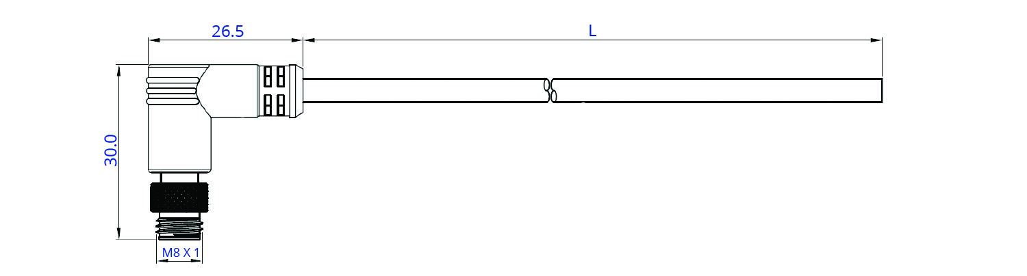 The SCM08-XXPXR-XXXX is an M8 over-moulded right angle plug cable assembly with a stub end for completion with a termination of your choice. The M8 plug is available in an A or B coding with 2 to 8 pin options. The cable is available in standard lengths of 0.5, 1, 1.5 and 2 metres, but we can offer a bespoke cable assembly to any length and with any termination.