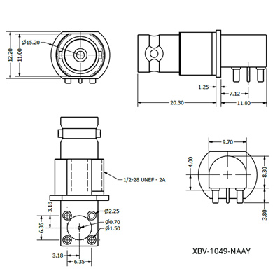 The XBV-1049-NAXX is a right angle PCB mounted BNC socket. XBV-1049-NAAW is suitable for frequencies up to 4GHz and XBV-1049-NAAY is suitable for frequencies up to 1GHz.